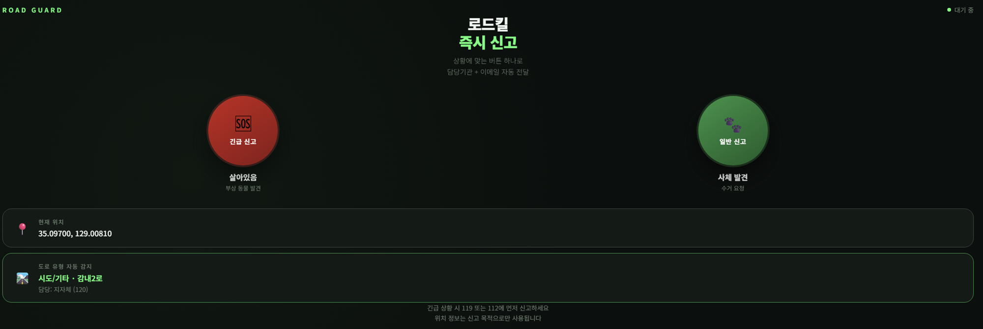 Road Guard는 버튼 하나로 로드킬을 즉시 신고할 수 있는 시민 참여형 앱입니다.
