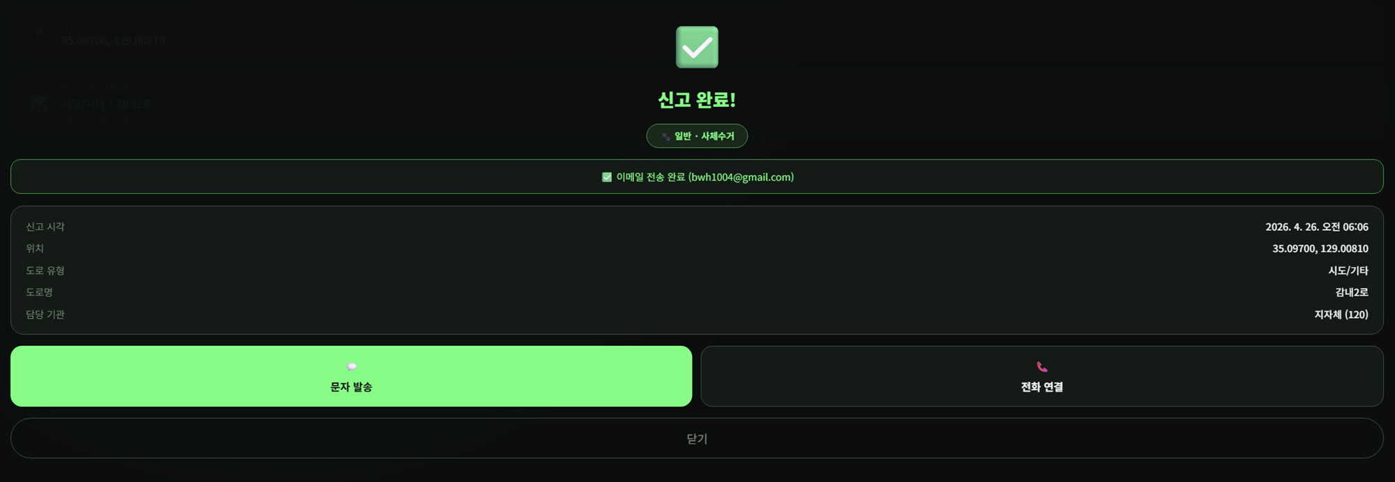 | 📧 데이터 자동 수집 | 신고 즉시 날짜/위치/도로유형 자동 기록 |
