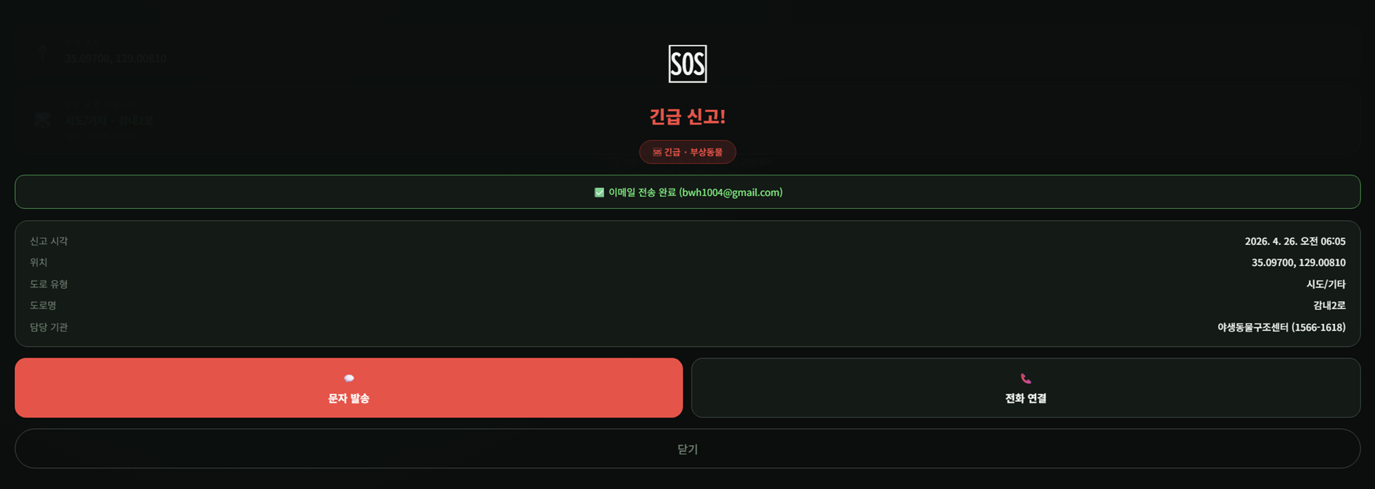 | 🐾 일반 신고 | 사체 수거 요청 → 도로공사/지자체 자동 연결 |