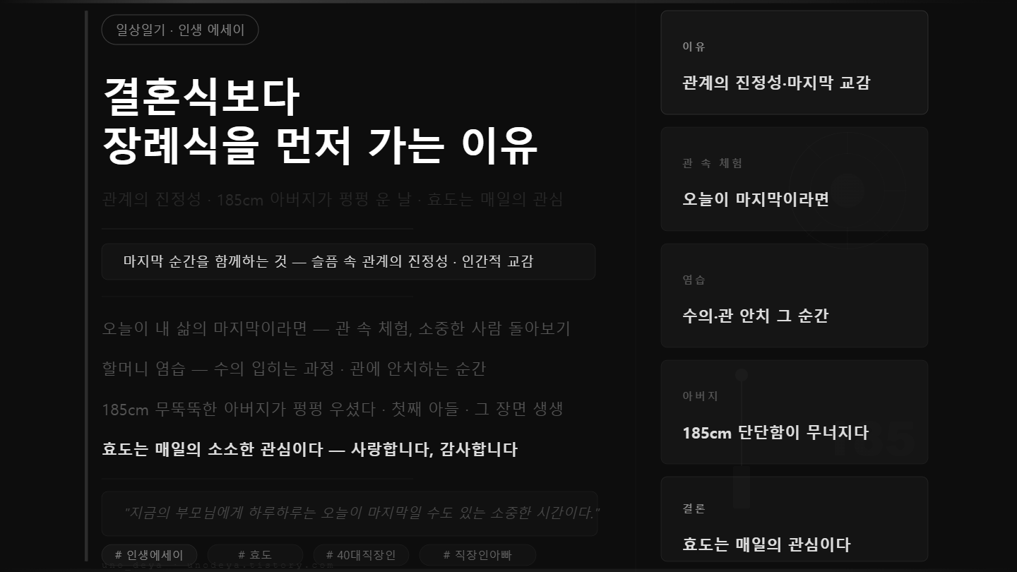 예전에도 그랬고 지금도 변함이 없는데, 결혼식보다 장례식 참석이 내게는 더 소중하다. 결혼식도 새로운 삶의 시작을 축복하는 자리라 참석은 하지만, 꼭 가야만 한다면 장례식을 택한다.