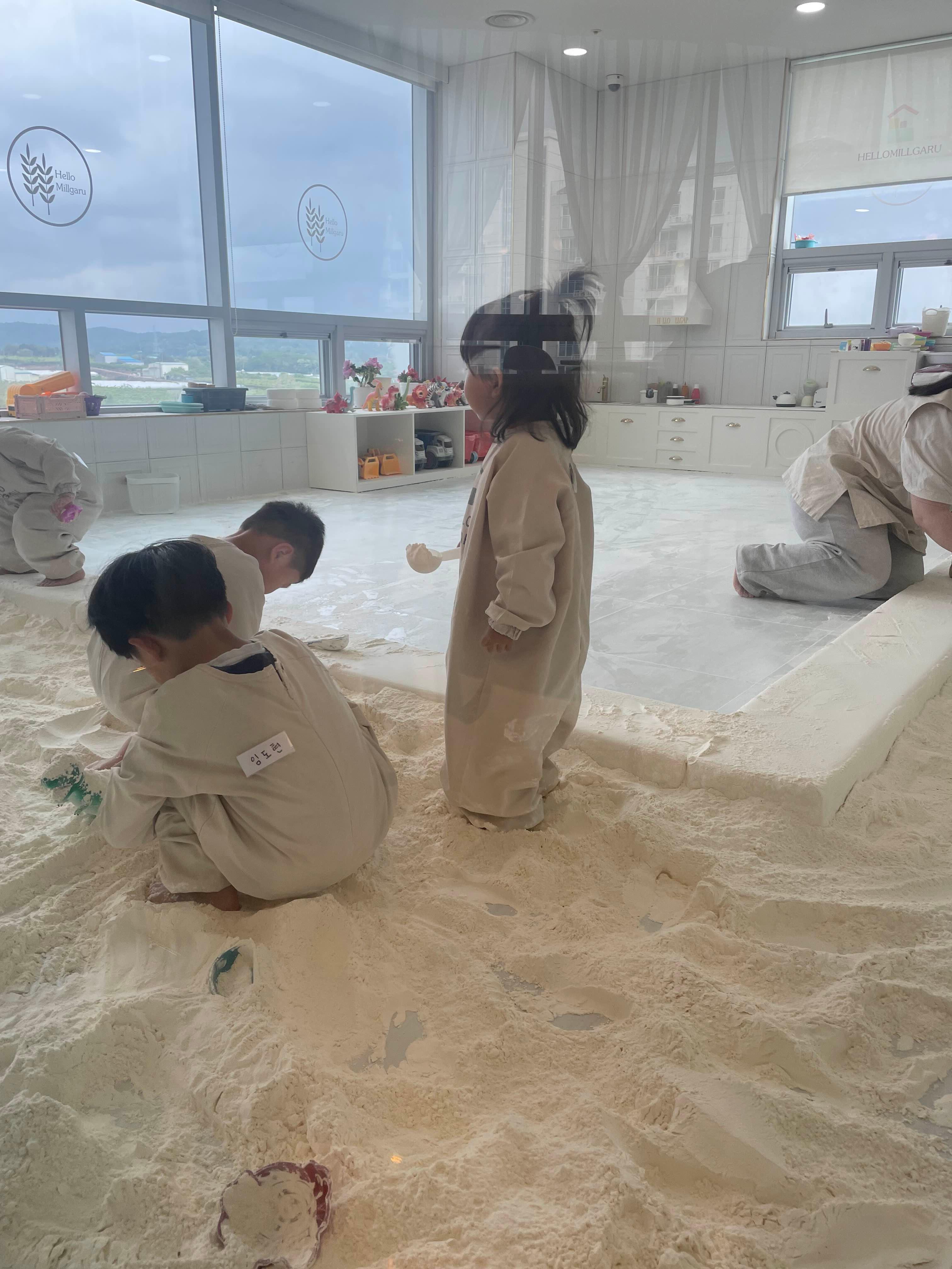그런데 입장하자마자 어린이집에서 노는 것처럼 바로 뛰어들었다. 밀가루 특유의 보들보들한 감촉이 손에 닿는 순간, 아이들은 뭔가에 홀린 것처럼 눈빛이 달라진다. 찹쌀 반죽이 손에 착 붙는 느낌, 반죽을 꾹 누를 때 나는 둔탁한 소리, 공간 전체에 퍼지는 밀가루 냄새. 그 모든 게 아이들한테는 완전한 놀이다.