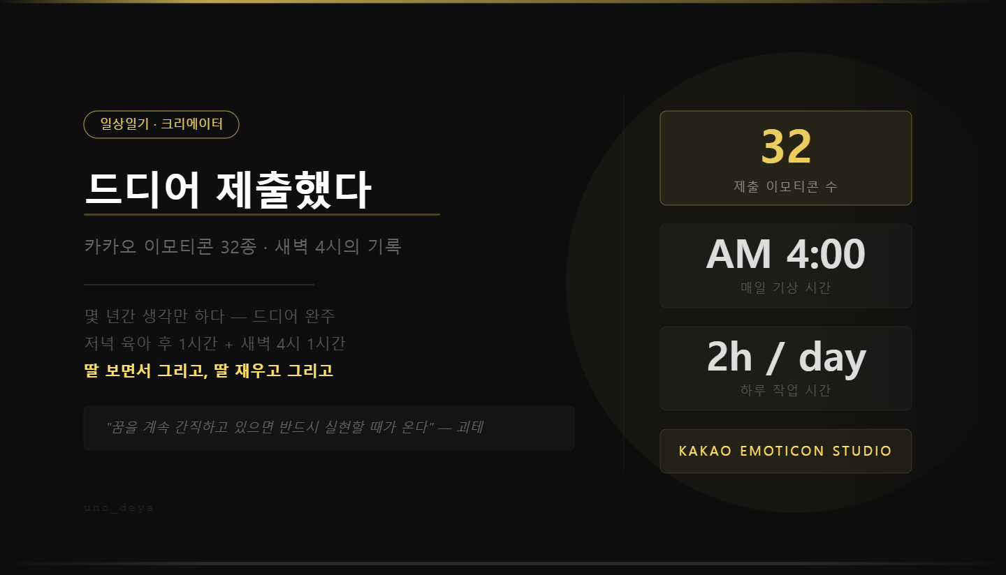 "나도 언젠간 이모티콘 만들어봐야지" 하고 생각만 하던 게 몇 년이었고, 막상 시작하고 나서 완성까지 또 몇 달이 걸렸다. 그 사이에 회사 일은 여전히 많았고, 저녁엔 아이 재우고, 새벽 4시엔 눈 비비고 일어나서 노트북 켰다.