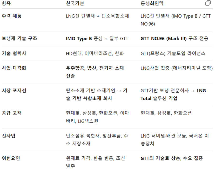 A4). 동성화인텍은 LNG업황과 GTT기술계약에 민감한 순수 LNG인프라 기업이며, 한국카본은 LNG 단열재에 더해 방산, 전기차, 우주항공 소재로의 다변화를 통해 장기 성장 기반이 더 넓습니다.